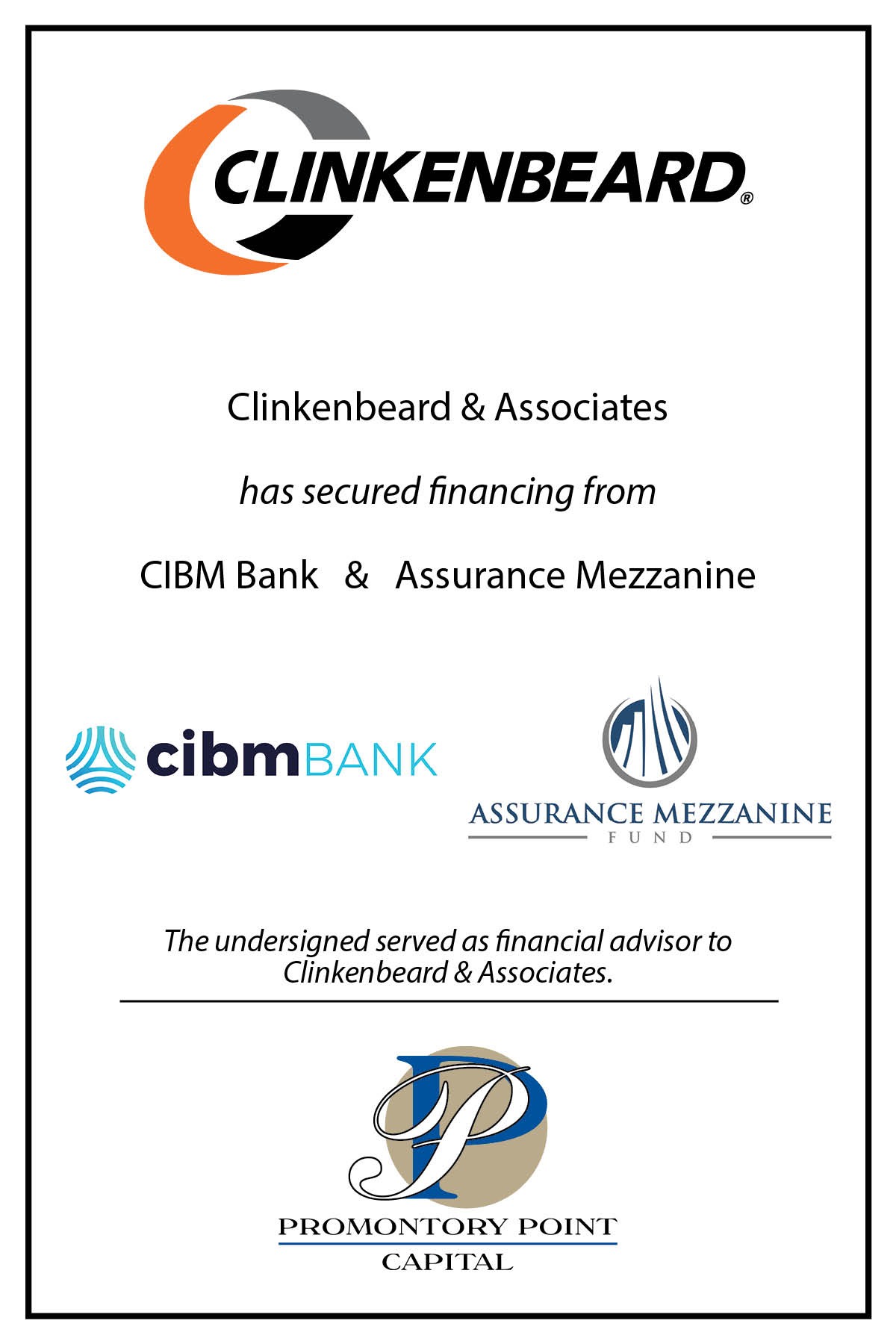 Despite the pandemic, several of the Company’s end markets continue to experience rapid growth, which has increased the demand for Clinkenbeard’s engineering capabilities and products. In particular, programs involving the training of military personnel represent an increasing proportion of global military spending, just one industry sector served by Clinkenbeard. As a result of increased demand for the Company’s products, PPC was engaged to arrange financing to better capitalize the business for continued growth. In addition to arranging new senior bank debt facilities for the Company, PPC’s engagement also included soliciting interest from non-bank providers of mezzanine financing. PPC supported Clinkenbeard and its ownership group through the financing effort which resulted in arranging both senior and mezzanine financing to support the Company’s growth plan. The financing transaction arranged by PPC for Clinkenbeard & Associates represented another successful Done Deal for Promontory Point Capital during 2021.