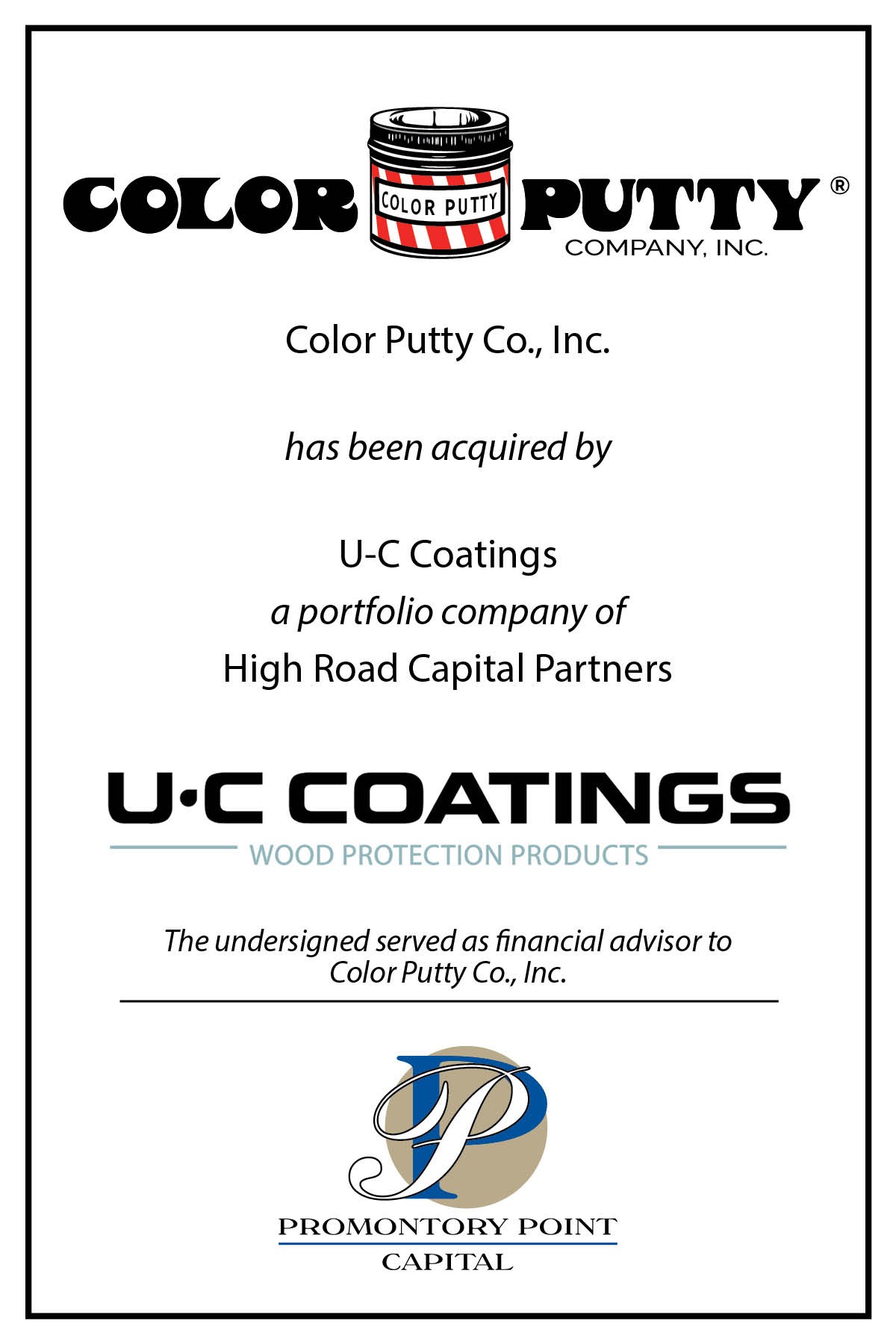As this family-owned business began to contemplate succession planning goals, the Company’s law firm referred the ownership group to Promontory Point Capital. PPC was subsequently engaged to explore strategic alternatives for this branded, building products business, and the firm marketed Color Putty to a targeted audience of strategic acquirers with existing exposure to the building products industry. After soliciting preliminary offers, PPC assisted in negotiating a Letter of Intent with U-C Coatings. Based in Buffalo, New York with a variety of operating units (including Kenosha, Wisconsin), U-C Coatings is a world leader in wood protection products that address surface protection, beautification, restoration, and repair. U-C Coatings is a portfolio company of High Road Capital Partners, a private equity firm based in Connecticut. PPC managed the entire engagement and assisted in closing the transaction during the second quarter of 2023 representing another successful Done Deal for our firm. Read Press Release
